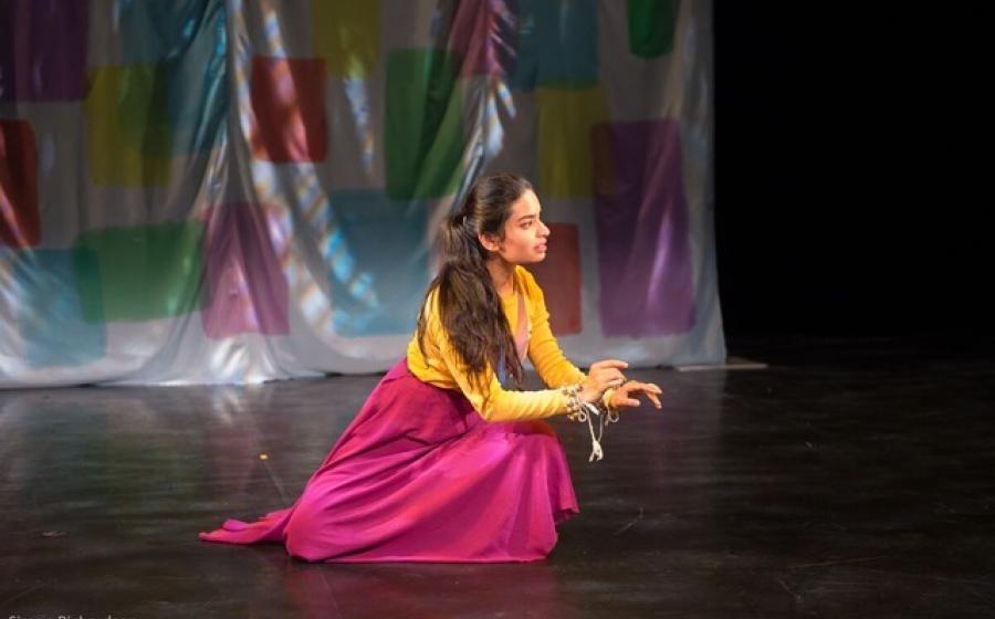 As the title suggests, this piece explores difference as well as commonality, and certainly offers variety. The three performers, Aakanksha Rawat, Laura Vanhulle and Mickael Marso Riviere bring a feast of talent to the stage, and the show allows space for Rawat to play with kathak’s foot percussion, for Vanhulle to weave a spell of a ribbon dance and for Marso Riviere to showcase high octane breakdance (along with guitar playing!). What stood out for Kizzy though, was the humour that threads through the piece right from the first appearance of the performers, looking, in Kizzy’s words, ‘like carpets’. These ‘carpets’ are the three performers wrapped in what I can best describe as three large, differently coloured pillowcases, such that all we can see at first are three coloured rectangles slowly unfurling, rocking and teasing each other. As ‘carpets’, they are remarkably expressive despite lacking faces and limbs, and their antics had the children in the audience giggling from the start. This remained Kizzy’s favourite part of the piece, despite some of the beauty and excitement of the later sections.