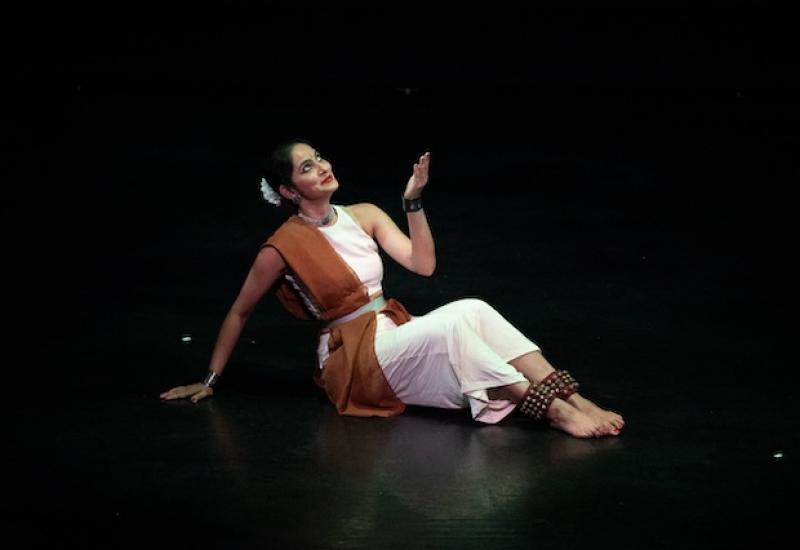 The six dancers each performed a solo divided into two halves sandwiching the two Ensemble pieces that we were there to see primarily, as these were new creations by the ‘mid-career’ artists Shane Shambhu and Seeta Patel. The choreographers had a week each with the dancers. They produced work in their signature styles: Shane Shambhu known for his humour, cheek and theatricality, and Seeta Patel for more technically based work exploring the edges of bharatanatyam. In my voice, Shane used the voices and back stories to individualise the dancers and create the content. It is a familiar device but was nevertheless effective in creating a new style varnam in which jattis are interspersed with the voice overs of the dancers, ‘My name is Annie, no not the Annie of the musical’. The dancers responded to the challenge with gusto and their enjoyment in delivery was infectious. The music conveyed the Scottish Highlands, discos and temples taking the audience on different journeys. The total theatre experience where movement works with music, text, gesture and expression offered a rich and multi-layered experience. The movement quality with stretched lines, deep plies and etched shapes was testimony to the standards achieved by the young dancers: Sundaresan Ramesh, Daniella Zak Verghese, Swati Seshadri, Shivaangee Agarwal, Kirsten Newell and Annie Simon.